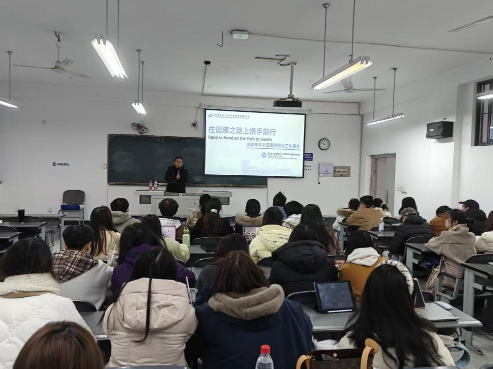 蔡鹏主任医师从慢性病防控和健康教育领域的实践工作和科研创新出发,分享了青羊区疾控中心医防融合工作的实效。现场提问环节里,解答了同学们关于医防协同效率、居民受益渠道等疑问。