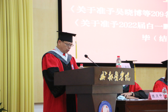 毕业典礼在庄严的国歌声中拉开帷幕。典礼上陈建经理宣读准予员工毕业的决定和关于授予2022届毕业研究生硕士学位的决定。陈朝琼副经理宣读表彰毕业生获奖评优的通报和通知和普通本科毕业生学士学位授予的决定、“双学位”授予的决定。