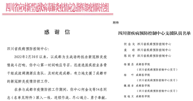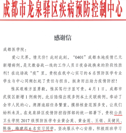 成都市龙泉驿区疾病预控制中心向2017级预防医学专业黄会英、黄金莲、王银、吴健民、陈扬、梅建邦6名实习学子,表达了感谢,赞扬学子们坚决服从中心安排,积极跟班学习并快速参与实践工作,与中心流调人员并肩作战,不分昼夜战斗在第一线,参与流调溯源、协助联系公安协查、信息统计等工作,极大缓解了疫情防控的燃眉之急,为龙泉驿区的疫情防控贡献了力量,他们用行动诠释了“健康所系、性命相托”的承诺。