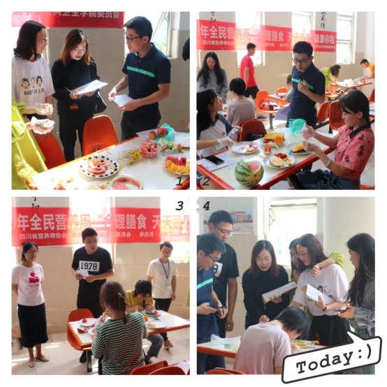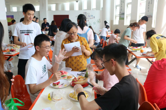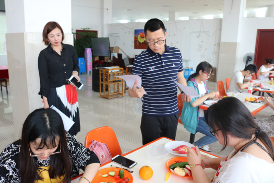 比赛环节,同学们都专心致志的制作蔬果拼盘,评审老师随机观察点评,三十分钟后,评审团老师对同学们的作品进行打分并评比。