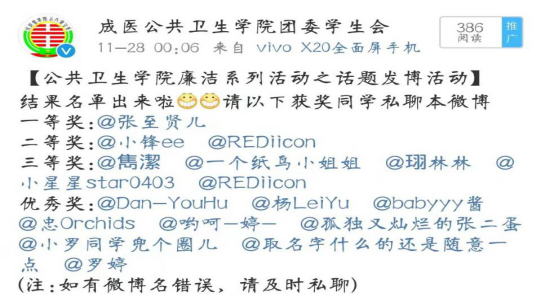 此次活动共收到各年级廉洁为主题的微博话题90多条留言,从中评选出一等奖一名,二等奖两名,三等奖三名和优秀奖十名,目的帮助老员工树立社会主义民主法治、公平正义、诚实守信、廉洁修身的理念,让师生获益匪浅。