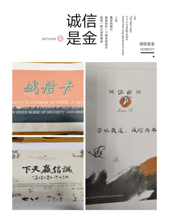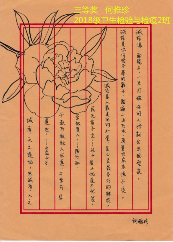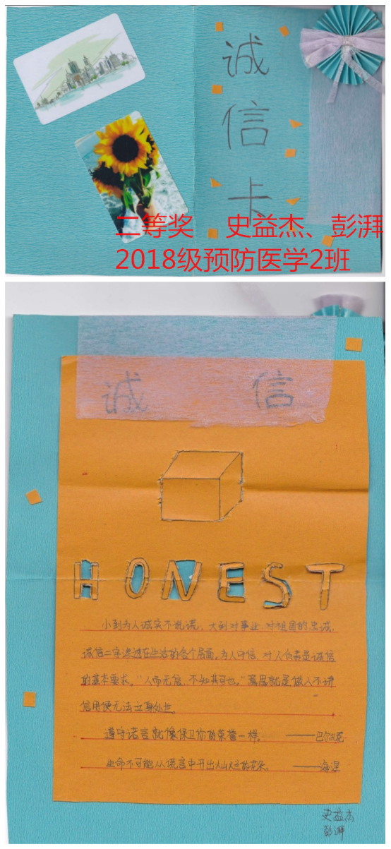 此次活动共收到大一新生以廉洁为主题的诚信卡80多张,从中评选出一等奖一名,二等奖两名,三等奖三名和优秀奖十名,是一次有效的廉洁诚信教育,帮助员工树立社会主义民主法治、公平正义、诚实守信、廉洁修身的理念,提高了广老员工的廉洁意识以及当代老员工对“廉洁修身、诚信做人”的理解和认识,让师生获益匪浅。