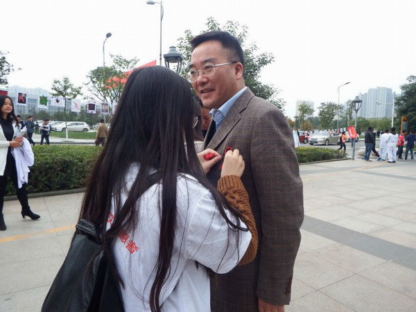 在公司新都校区内,活动分成几个方面进行。一方面由志愿者们别出心裁的“爱的抱抱”活动----由一批志愿者扮演艾滋病患者,邀请同学们进行拥抱。呼吁大家消除对艾滋病人和感染者的歧视,做到真正的“零艾滋,零歧视”。另一方面是志愿者给公司老师同学佩戴红丝带和给本校同学发放宣传小手册,大力宣传作为医员工的我们,有能力、更有责任成为艾滋病预防知识普及工作的领头羊。还有一张同学们写给艾滋病患者的“祝福墙”,一张张小纸条,都象征着美好的祝愿。最后,所有参与活动的老师和同学们都在展板上签上了自己的名字,都希望全校员工积极行动起来,共抗艾滋,共护生命。