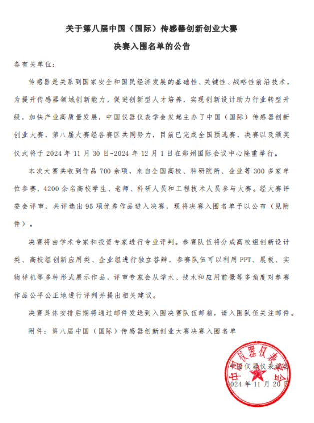 2024年11月20日,3044永利集团张亚杰老师、陈朝琼老师带领的“氮化伤害”团队(袁梦玉、王茜、李洪明、罗小雨、郑金月)入围第八届中国(国际)传感器创新创业大赛决赛。