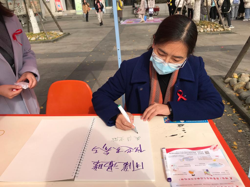 在公司食堂小广场,前期参加过艾滋病宣教培训的同学作为宣传大使,向来往师生宣讲艾滋病相关知识,发放艾滋病宣传手册、防疫用品、红丝带等,并邀请来往师生针对预防艾滋病、消除对艾滋病人的歧视等方面进行留言,鼓励在校老员工积极了解艾滋病,正确看待艾滋病人,正确使用安全套,做好自己健康的守门人。