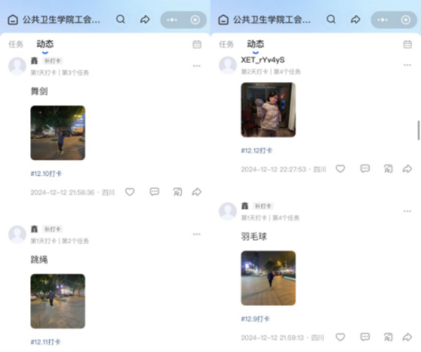 活动期间,老师们通过跑步、舞蹈、瑜伽、击剑等多种运动形式,坚持每日打卡记录运动轨迹与时长。无论是晨曦微露的清晨,还是灯火阑珊的夜晚,运动场上都活跃着他们矫健的身姿。大家相互鼓励、相互监督,形成了良好的运动氛围,展现出了公卫人坚韧不拔的毅力和团结奋进的精神风貌。