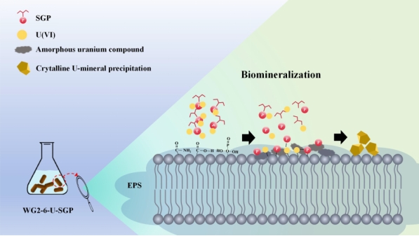 铀可能引起的公共卫生风险是研究者关注的焦点,有研究表明,微生物生物矿化显著影响铀在环境中的行为,但微生物矿化铀的机理特别是对土著微生物在有机磷存在下矿化铀机制的理解仍不清楚。研究发现,假单胞菌WG2-6生物矿化铀后主要以无定形U-P复合物的形式存在并可转化为晶状纳米矿物H2(UO2)2(PO4)2·8H2O,胞外聚合物(EPS)在矿化中起着促进作用并为形成稳定的矿化产物提供了成核位点。
