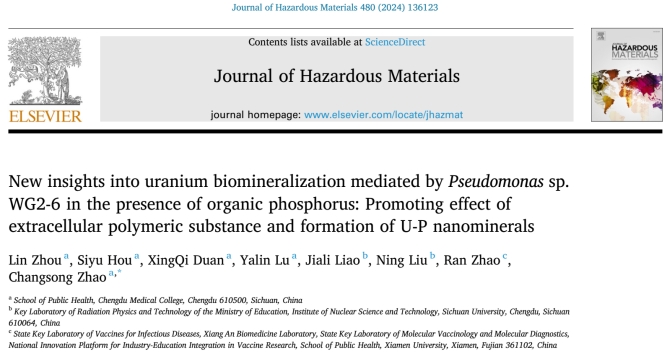 近日,公司2022级MPH硕士研究生周琳在《Journal of Hazardous Materials》(中科院一区Top,最新影响因子:12.2,期刊JCR排名<5%)杂志上发表题为New insights into uranium biomineralization mediated byPseudomonassp. WG2-6 in the presence of organic phosphorus: Promoting effect of extracellular polymeric substance and formation of U-P nanominerals的学术论文。该研究为有机磷存在下微生物介导的铀生物矿化提供了新见解。