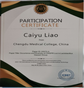 2022级公共卫生专业硕士研究生廖彩羽在第十五届生物信息学和生物医学技术国际会议(2023 15th International Conference on Bioinformatics and Biomedical Technology)大会上做题为“Occurrence and diversity of CRISPR loci in Lactobacillus gasseri group”的全英文口头报告,与参会专家学者在格氏乳杆菌中CRISPR-Cas系统的直接重复序列RNA二级结构预测及其最小自由能等方面进行了交流和探讨。报告得到了参会专家学者的普遍认可和关注。据悉,这是公司首位研究生在国际会议上采用全英文口头报告。
